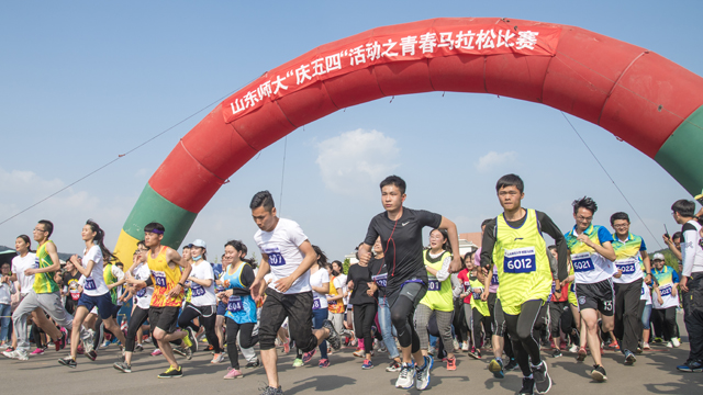 五月的师大,花团锦簇,春意盎然。为纪念“五四”运动98周年,5月4日下午,山东师范大学庆“五四”活动之青春马拉松比赛在长清湖校区图书馆前广场拉开帷幕。长清湖校区办公室、学生工作部、公安处、后勤管理处、图书馆、校团委、历史与社会发展学院、体育学院等单位负责同志,各学院辅导员及600余名运动员参加开幕式。长清湖校区办公室主任张敬涛宣布比赛开始。