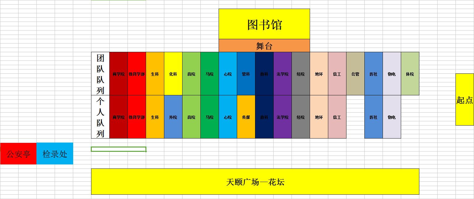 团队赛运动员必须统一着装。为保证检录高效的进行,各学院须由一名人员清点本学院包括团队与个人的所有参赛队员,由该同学清点完毕后来检录处进行检录。检录后听从工作人员的安排带到指定位置,每学院站一纵队。下图为观看开幕式的站位,请通知到每位同学。
